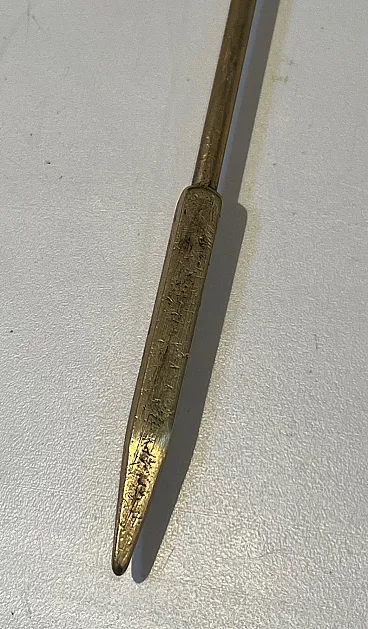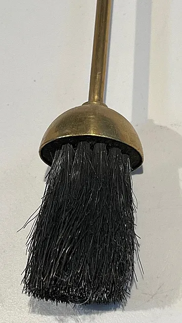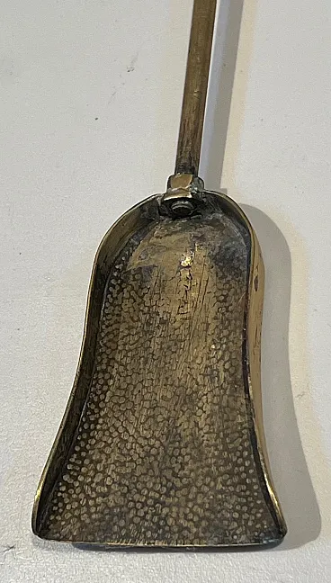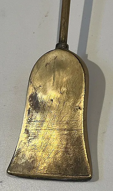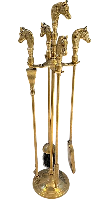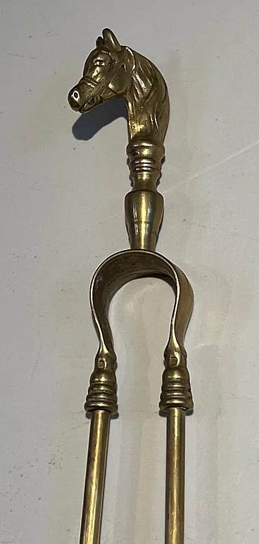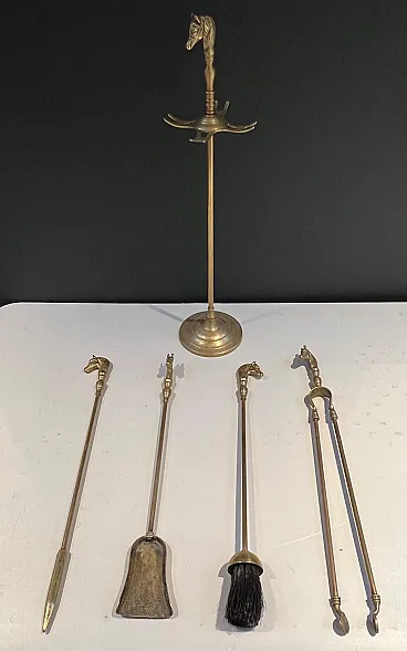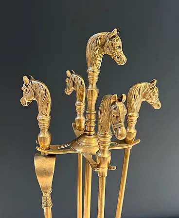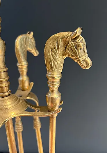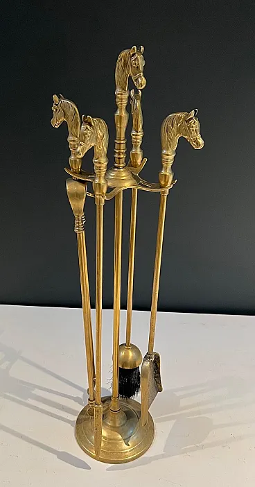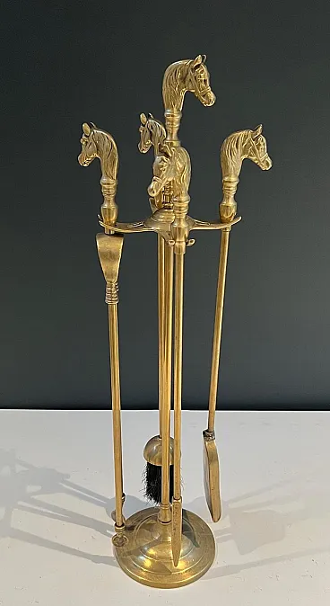 This very nice and elegant neoclassical style fireplace tools are made of brass. They are ornated with chiled brass horse heads. This is a French work. Circa 1950