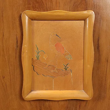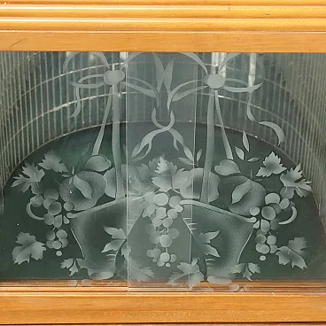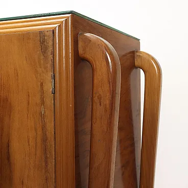 Buffet with bar compartment in the center, with sliding doors in transparent glass with decorations and covered with mirrored glass inserts, side hinged doors with decorative panels on the doors, walnut veneer and top with back-treated glass resting on it.