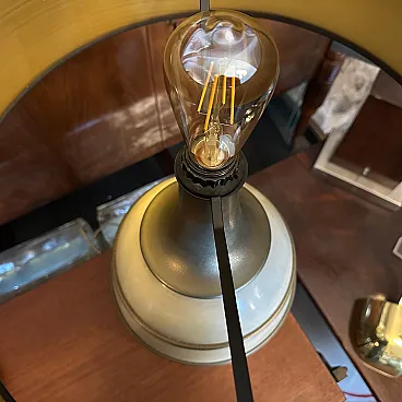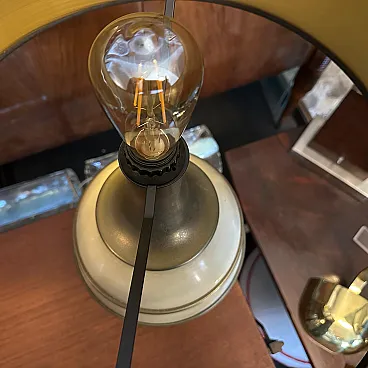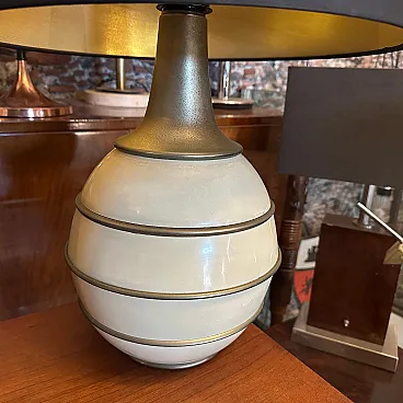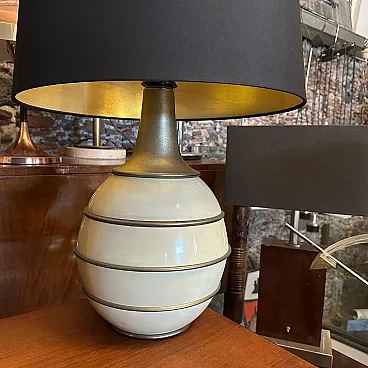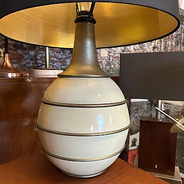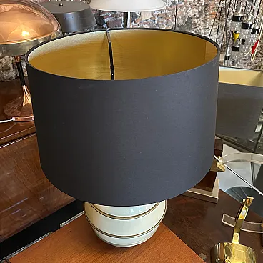 This 1970s Mid-Century Modern Italian table lamp, in the manner of Tommaso Barbi, exudes sophisticated elegance with its distinctive design. The base features a layered, bulbous form crafted from ivory lacquered metal, accented by sleek brass bands that create a harmonious balance between texture and shine. The warm brass detailing enhances the luxurious aesthetic, while the ivory lacquer offers a timeless and understated appeal. Topped with a bold black drum lampshade with gold inside, the contrast adds a contemporary edge to the lamp's overall design. This piece captures the essence of Italian craftsmanship and style, making it a perfect statement addition to any mid-century or modern-inspired interior. Height of lamp without lampshade 42cm, the lamp is in working order and it has normal signs of use and age.