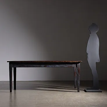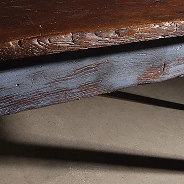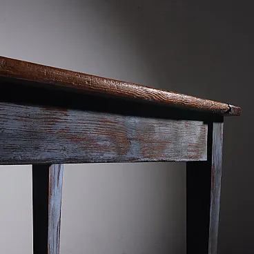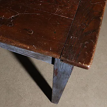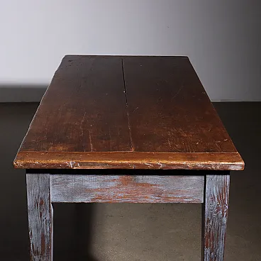 Rustic table in elm wood from the late 19th century, truncated pyramid legs, traces of blue paint on the base, wooden top finished with waterproof varnish.