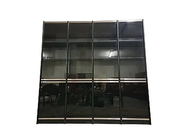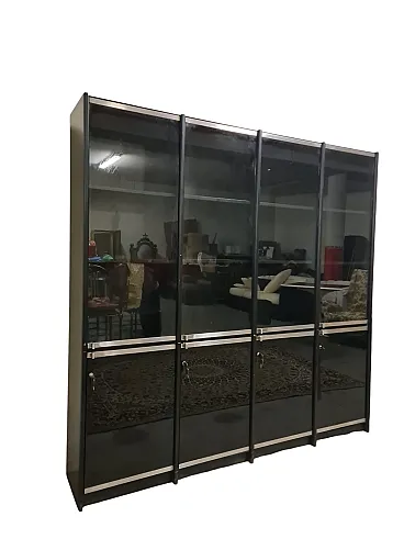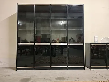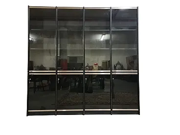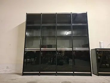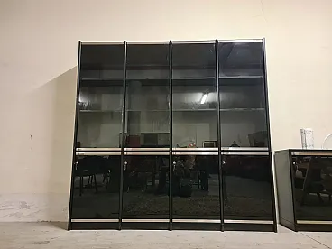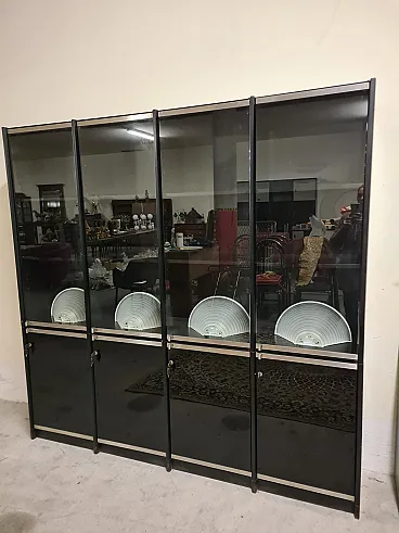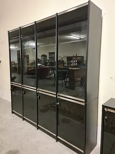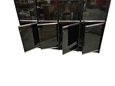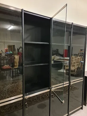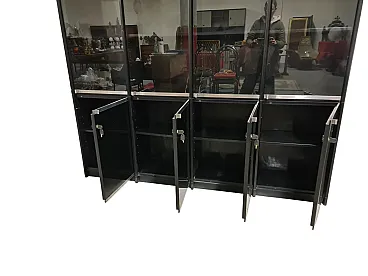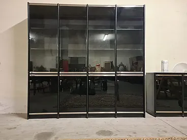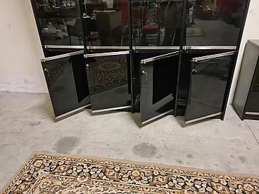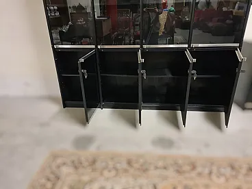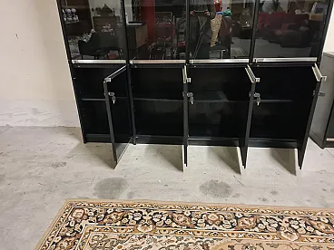 Elegant glossy black lacquered wood, glass and satin steel profiles.