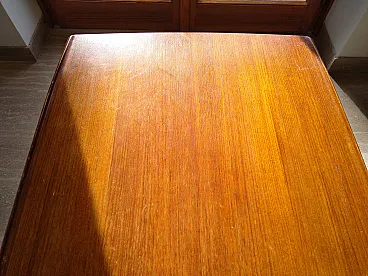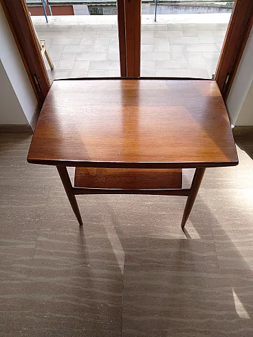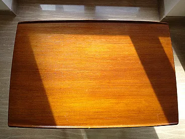 Rectangular Scandinavian Scandinavian table, MM Moreddi Danmark design. Composed of a upper shelf with raised edges on the sides, a lower shelf and tapered legs. Made completely in massive teak with brass details. Montesacro area