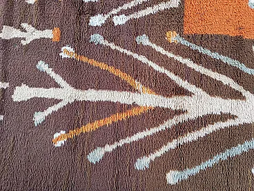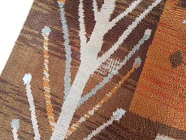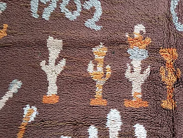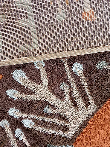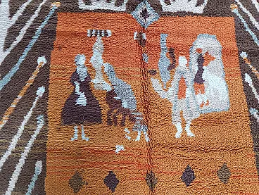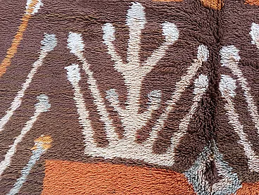 1960s rug with dimensions 280 x 198, made of wool. It features an orange background with a brown border, which brings out a stylized design with plants and characters on an orange background, creating a rustic yet sophisticated atmosphere. It is a folk-popular-inspired piece, reminiscent of traditional Finnish "ryijy" rugs, with origins dating back to 1818. The carpet patterns evoke motifs found in the book RYIJY: The Finnish Ryijy-Rug (pp. 63-65), which documents the evolution of this traditional style. Mechanical frame machining as you can see in the last photo there is a small area where the fleece is a little worn