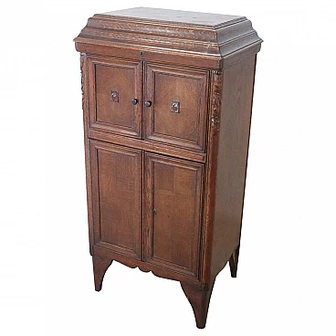 Particular cabinet in oak wood dating back to the 1940s. Delicate carving decoration on the front and sides. The upper lid opens and has a comfortable compartment. Excellent condition some signs of internal wear and tear. This cabinet for its small size is also suitable for small rooms. Price negotiable send also your proposals for purchase.