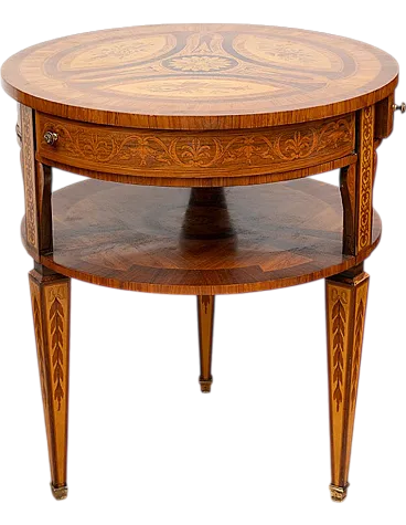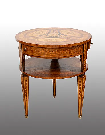 Description: Centrostanza table in polychrome woods belonging to the second half of the twentieth century.