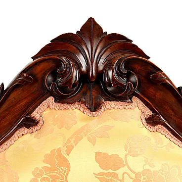 Umbertino living room in walnut, composed of two armchairs and six chairs. Seat, back and armrests padded, covered in excellent damask fabric. Turned feet, back with leaf carvings. Small losses. Italy, late 19th century.