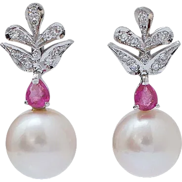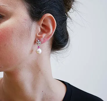 Earrings with white pearls, rubies, diamonds and platinum, 1970s