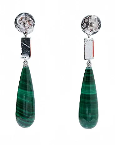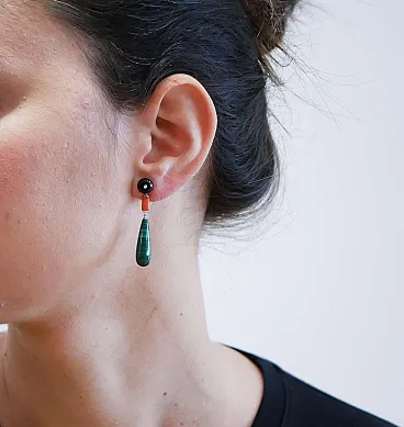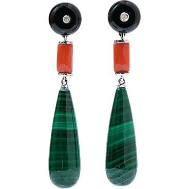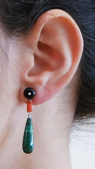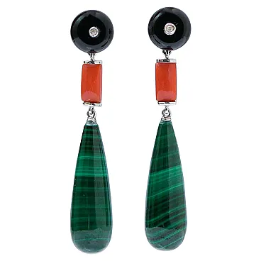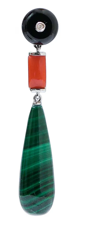 Earrings with onyx, coral, malakite, diamonds, platinum, 2000s