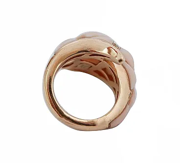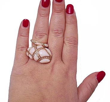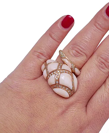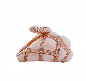Coral, diamonds, 14 Karat rose gold snake ring, 1950s