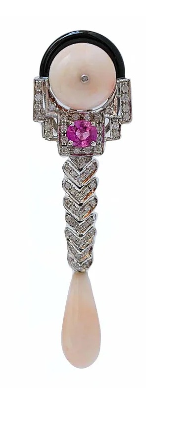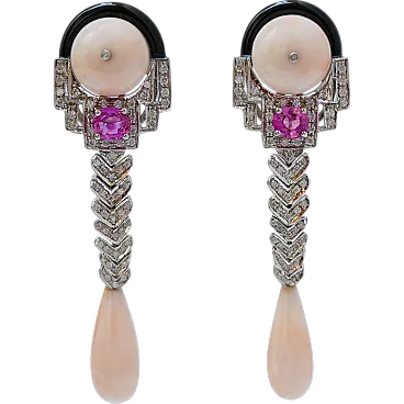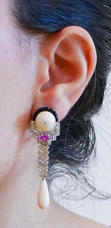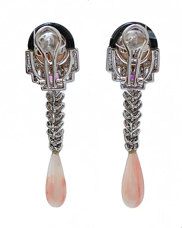 Coral, onyx, rubies, diamonds, white gold earrings, 2000s