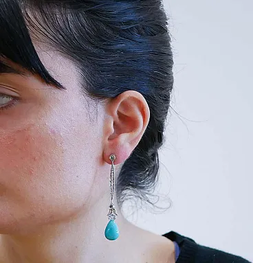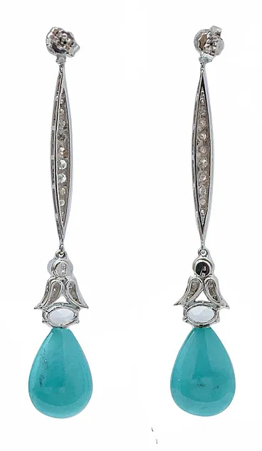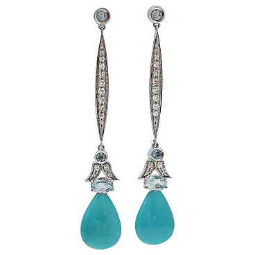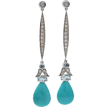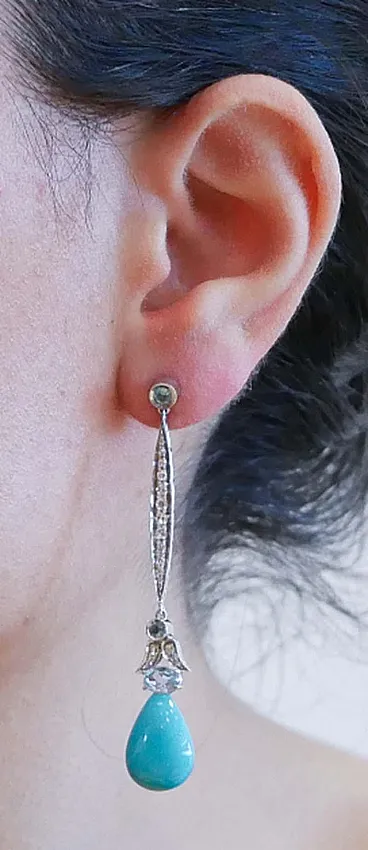 Aquamarine colour topaz, turquoise, diamonds, gold earrings, 1970s