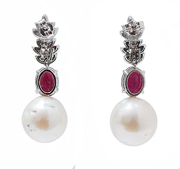 White gold earrings with pearls, rubies, diamonds, 1980s