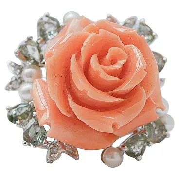 White gold ring with coral, sapphires, diamonds, pearls, 1950s