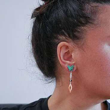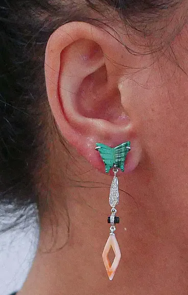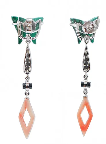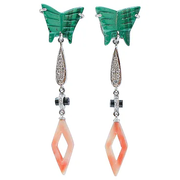 Earrings in coral, diamonds, malakite, onyx, platinum, 1970s
