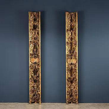 Pair of carved corner pilasters with places for a porcelain collection; supported by three carved feet, they develop on the entire surface a carving with leafy curls and flowers that act as a support for the shelves or as a support with a curl for the lodgings of the saucers. Following the movement of the carving there are in fact the concave lodgings for dishes and a series of green tinted reserves on the uniform mecca gilding that covers the entire surface.
