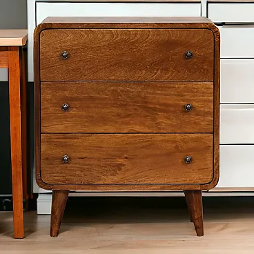 To match the other products from the curved collection, this mini chest of drawers has been constructed from 100% solid mango wood in a rich chestnut finish and stands on 4 Nordic style legs. It features shiny accent knobs on each drawer providing easy access when storing any clothes, towels, duvets, etc. The curved design provides smooth, safe corners and gives the product a modern and contemporary look which is perfect for city homes and apartments. This product is part of the Recession Collection.
