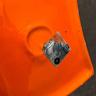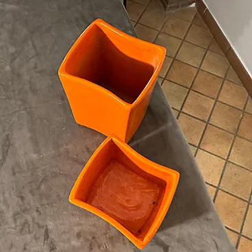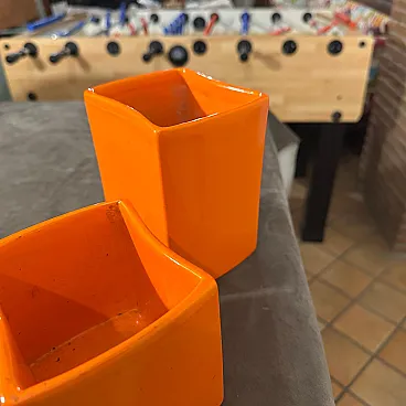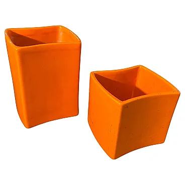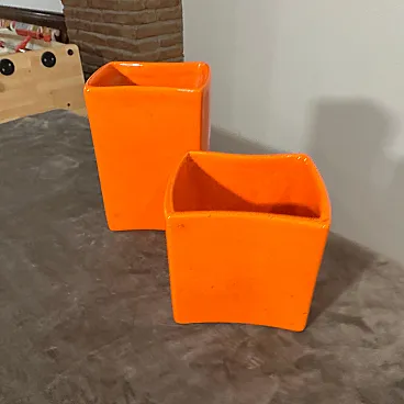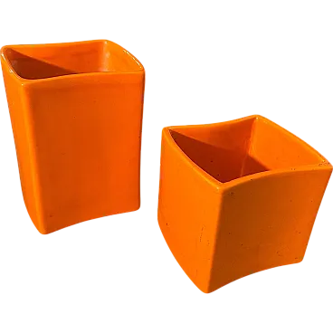 These ceramic vases, designed by Franco Bettonica for Gabbianelli in the 1970s, are excellent examples of modern Italian design. Franco Bettonica, a prominent Italian designer known for his minimalist and innovative approach to modernist forms. Gabbianelli, a renowned Italian ceramics company celebrated for its bold and creative designs. These vases are firmly rooted in the aesthetic of the 1970s, reflecting the era's penchant for bold colors and geometric experimentation. They are indicative of modernist design with a touch of playfulness, balancing functionality and artistry. The vases are made from glazed ceramic, giving them a smooth, shiny surface that highlights their vibrant color and sculptural form. The vivid orange glaze is striking and quintessentially 1970s, adding a pop of warmth and energy to any space. Each vase features a unique, slightly irregular geometric shape. The designs explore subtle curves and angles, adding visual intrigue. These vases are both decorative and functional, suitable for holding flowers or standing alone as sculptural accents in an interior. These vases serve as vibrant, artistic focal points in a mid-century modern or contemporary interior, embodying the bold spirit of 1970s Italian design.