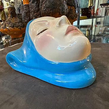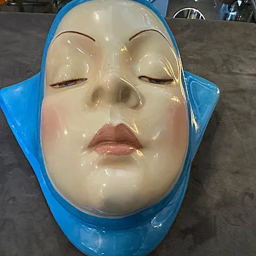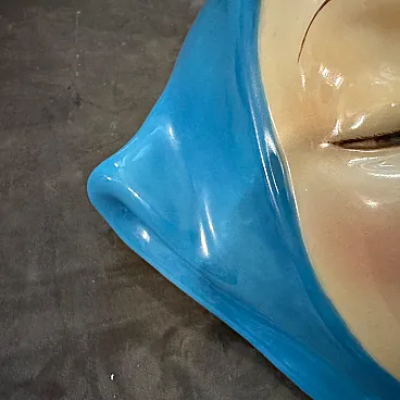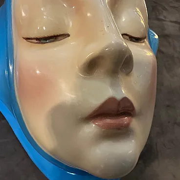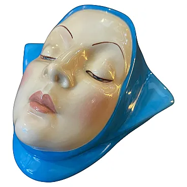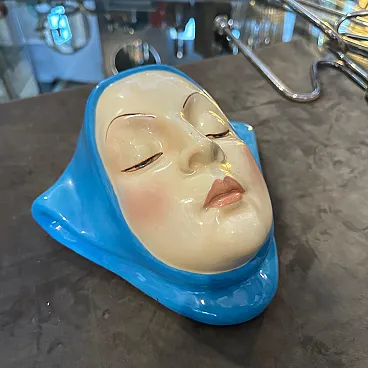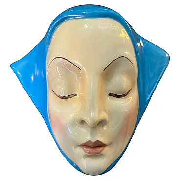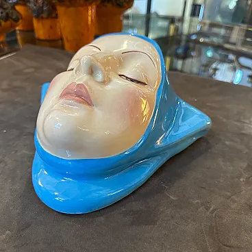 Helen Koenig Scavini (1886-1974) - Lenci - Torino Cast earthenware plaque painted in polychrome. On the back Lenci Made in Italy. The plaque portrays the face of a young girl with closed eyes, exuding calmness, serenity, and introspection, It embodies a timeless elegance, characteristic of Helen Koenig Scavini's work, which often blends softness with vivid, sculptural details. The face is delicately sculpted, with fine features including thin, arched eyebrows and gently closed eyelids. The contours of the scarf are smooth and dynamic, framing the face and adding a sense of movement to the otherwise tranquil design. Helen Koenig Scavini, the founder and artistic director of Lenci, is renowned for her whimsical and high-quality ceramic creations. This piece is designed as a wall plaque, meant to be hung and appreciated as a decorative art object. Its size and striking color make it an excellent focal point for a mid-century modern or vintage-inspired space. Helen Koenig Scavini’s works for Lenci are highly collectible, prized for their craftsmanship, artistry, and distinctive style. This plaque is not only a decorative piece but also a testament to the artistic and technical excellence of mid-century Italian ceramics. It's in perfect condition.