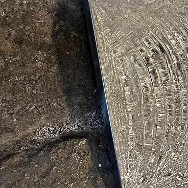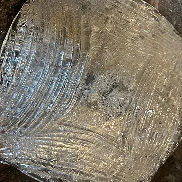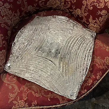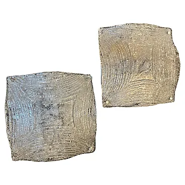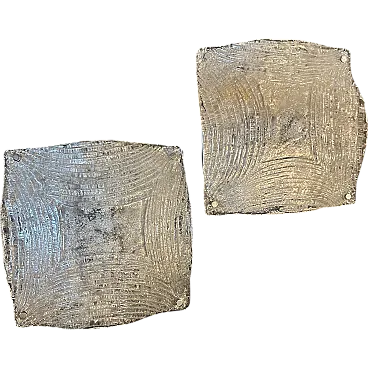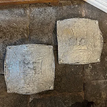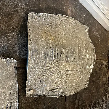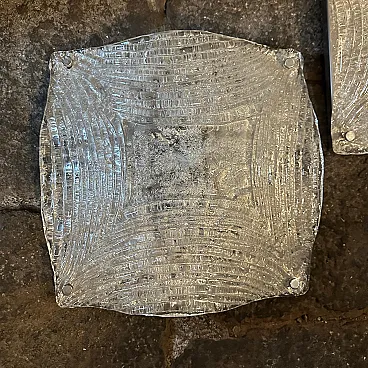 These 1970s Mid-Century Modern Murano Glass Big Square Wall Sconces by Mazzega are exceptional examples of Italian glass artistry and design from a sought-after era. Their bold geometric forms, handcrafted quality, and versatile nature make them highly desirable pieces for collectors and design enthusiasts. Their adaptability as either wall sconces or ceiling lights and their functional design and allows for flexible placement in various spaces. The textured Murano glass provides a soft, diffused light. The layered glass likely filters the light, creating a warm and inviting ambiance. They are in very good conditions overall and in working order.