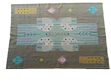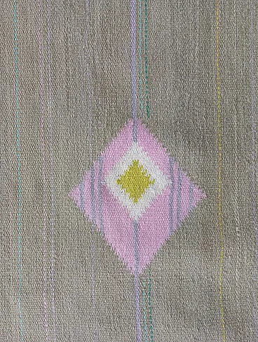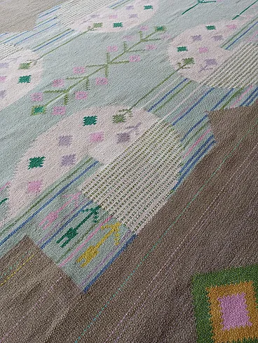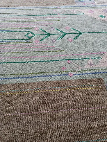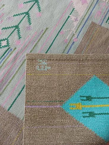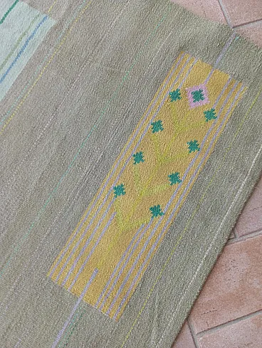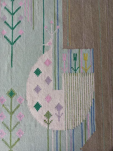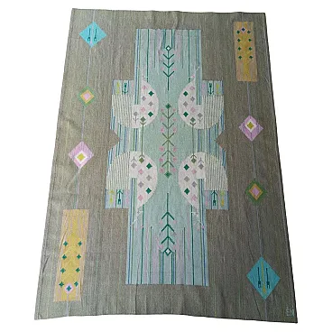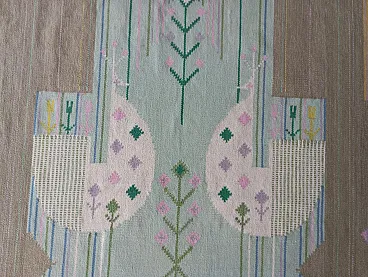 This Swedish tapestry/carpet of dimensioi 240 cm. x 170 cm. is the work of Hungarian designer Eva Nemeth, and bears her monogram in the corner. Flat workmanship like a kilim. The design evokes a garden with stylized drawings of birds, plants and flowers. The background features two shades of green that highlight the designs. . Decorative elements feature details in bright yellow, purple, and light blue, adding lively touches and a harmonious contrast reminiscent of nature in bloom. Nemeth's graphic style gives the piece a modern, abstract quality while maintaining a strong inspiration from the natural world and Scandinavian textile tradition. Éva Németh (1930-2019) was a Hungarian textile designer, best known for carpets and tapestries. He studied at the Moholy-Nagy University of Art and Design. During the 1970s and 1980s she won textile design awards and was featured in numerous solo and group exhibitions in Budapest and other European cities. Many of his works feature animal motifs such as birds. His designs were produced by the Ziola company in Hungary and were mainly sold in Scandinavia, especially in Copenhagen.