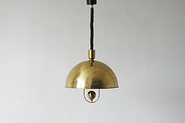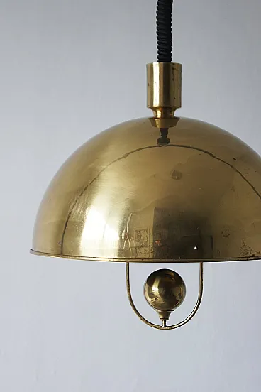 Brass semicircular shaped lampshade. This is a lamp with adjustable height, which can be adjusted at any time with a central cable. The lighting effect of the lamp is extremely beautiful. The design creates a very elegant and pleasant light. The lamp creates a very cozy atmosphere and is of very high quality. Designed by Florian Schulz and manufactured in Germany in the 1970s. It fascinates with its exclusive design. Preserved in original condition. Electrical components checked by a professional electrician.