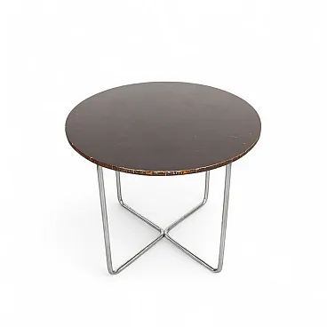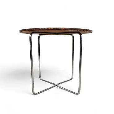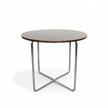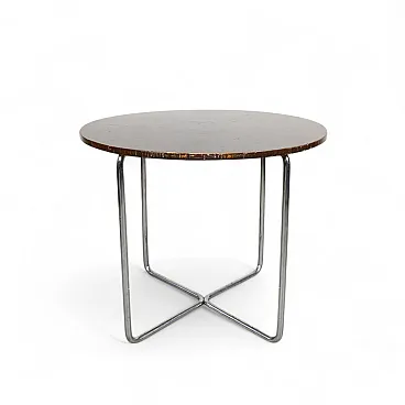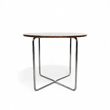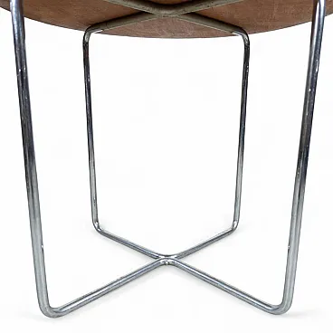 The B 27 table, designed by Marcel Breuer in 1927, is a minimalist and iconic piece. It features a sleek tubular steel frame with a wooden circular tabletop, embodying the Bauhaus aesthetic of form following function. Its design emphasizes simplicity and functionality, making it a timeless and versatile piece for various spaces. Crafted from chrome plated tubular steel and lacquered wooden top. In very well preserved original condition. Manufactured by Mücke & Melder, under Thonet license, former Czechoslovakia, 1930s.