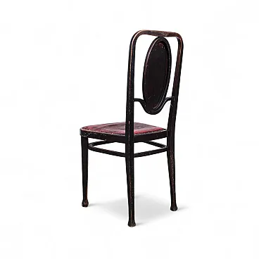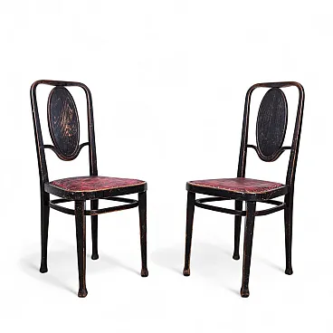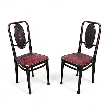 A rare pair of chairs designed by the esteemed Viennese architect Marcel Kammerer in 1908. These chairs are crafted from stained beech wood and feature leather-upholstered seats, showcasing the elegant design and superior craftsmanship of the early 20th century. These chairs are in their untouched original condition, preserving their historical authenticity and charm. Each chair is branded with the Thonet embossed mark and retains its original paper labels, attesting to its provenance and quality. These chairs have a rich history, having been used in a café at the Municipal House in Prague, adding a layer of cultural significance to their already impressive pedigree. This pair represents a unique opportunity to own a piece of design history, beautifully maintained over more than a century.