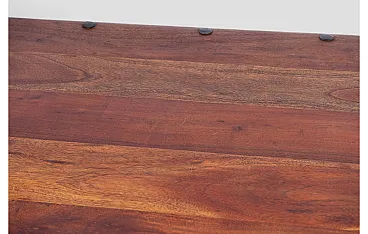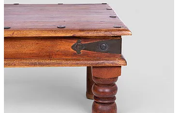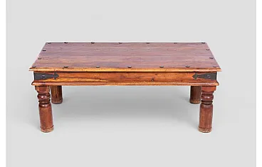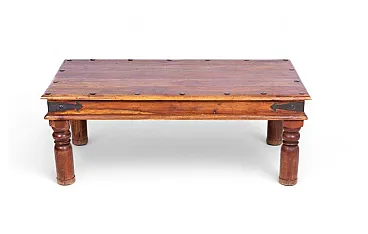 This elegant ethnic coffee table is a unique piece from Northern India, crafted from solid Indian Teak, locally known as Barmati Tik Wood, prized for its durability and natural beauty. The design combines rustic charm with traditional style, featuring iron fastenings around the tabletop edge that add a robust and artisanal character. The turned legs enhance its elegance, completing its authentic and timeless look. Ideal for both modern and traditional interiors, this coffee table brings an exotic and warm charm to the living room. The quality of materials and attention to detail make it a durable and resilient furniture piece, destined to become a focal point in any space. Perfect for lovers of ethnic style and sophisticated design, this piece brings a touch of history and authenticity to your home.