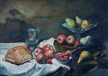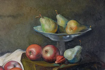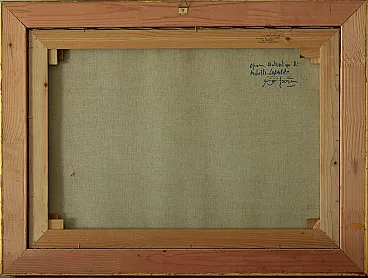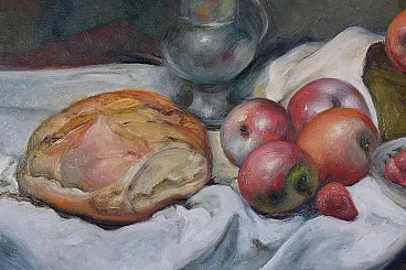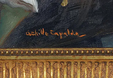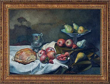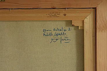 This exquisite still life painting by renowned Italian artist Achille Capaldo (born in Naples, 1937) showcases a rich and vibrant composition of fruit, bread, and silverware, masterfully arranged in a classic still life setting. The meticulous brushwork and attention to detail highlight Capaldo’s signature style, blending realism with a soft painterly touch, creating a warm and inviting atmosphere. Painted in oil on canvas, the artwork measures 50x70 cm and is elegantly framed in an original gold-leaf wooden frame (total size 63x83 cm), enhancing its timeless aesthetic. The painting bears Capaldo’s signature on the front and an authentic inscription on the back, confirming its provenance and originality. Achille Capaldo’s works are well-regarded in Italian fine art circles, particularly for their evocative compositions and refined technique, making this piece a valuable addition to any art collection, classic or modern interior.