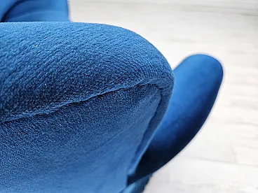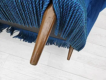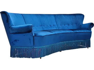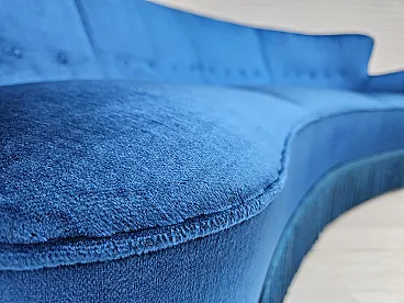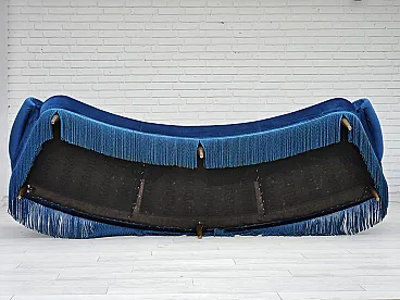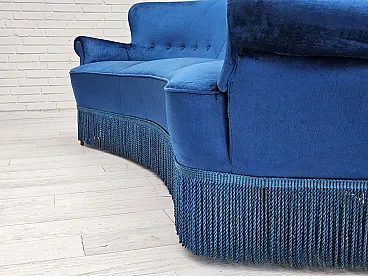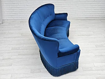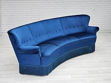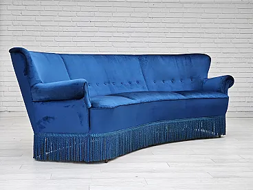 Danish 3-seater curved sofa blue velour and beech wood, 60s