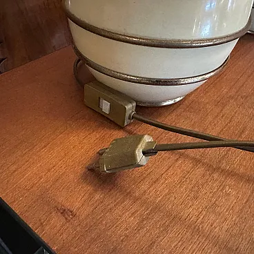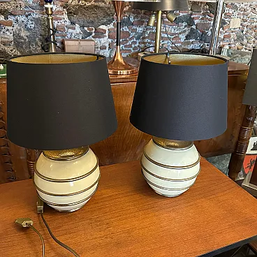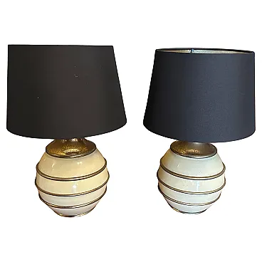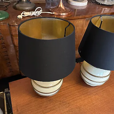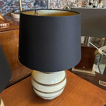 This 1970s Mid-Century Modern set of Italian table lamps, in the manner of Tommaso Barbi, exudes sophisticated elegance with its distinctive design. The base of the lamps features a layered, bulbous form crafted from ivory lacquered metal, accented by sleek brass bands that create a harmonious balance between texture and shine. The warm brass detailing enhances the luxurious aesthetic, while the ivory lacquer offers a timeless and understated appeal. Topped with a bold black drum lampshade, the contrast adds a contemporary edge to the lamp's overall design. This set of table lamps captures the essence of Italian craftsmanship and style, making it a perfect statement addition to any mid-century or modern-inspired interior. Height without lampshade is 25 cm. they have been rewired and are ready to use.