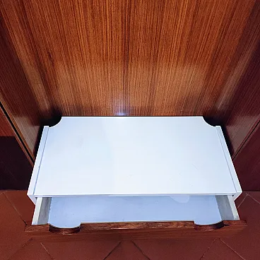 - Three modules (h 179, 64 wide, prof 18 cm), the central with white lacquered wooden chest of drawers with a walnut drawer front and open compartment below.