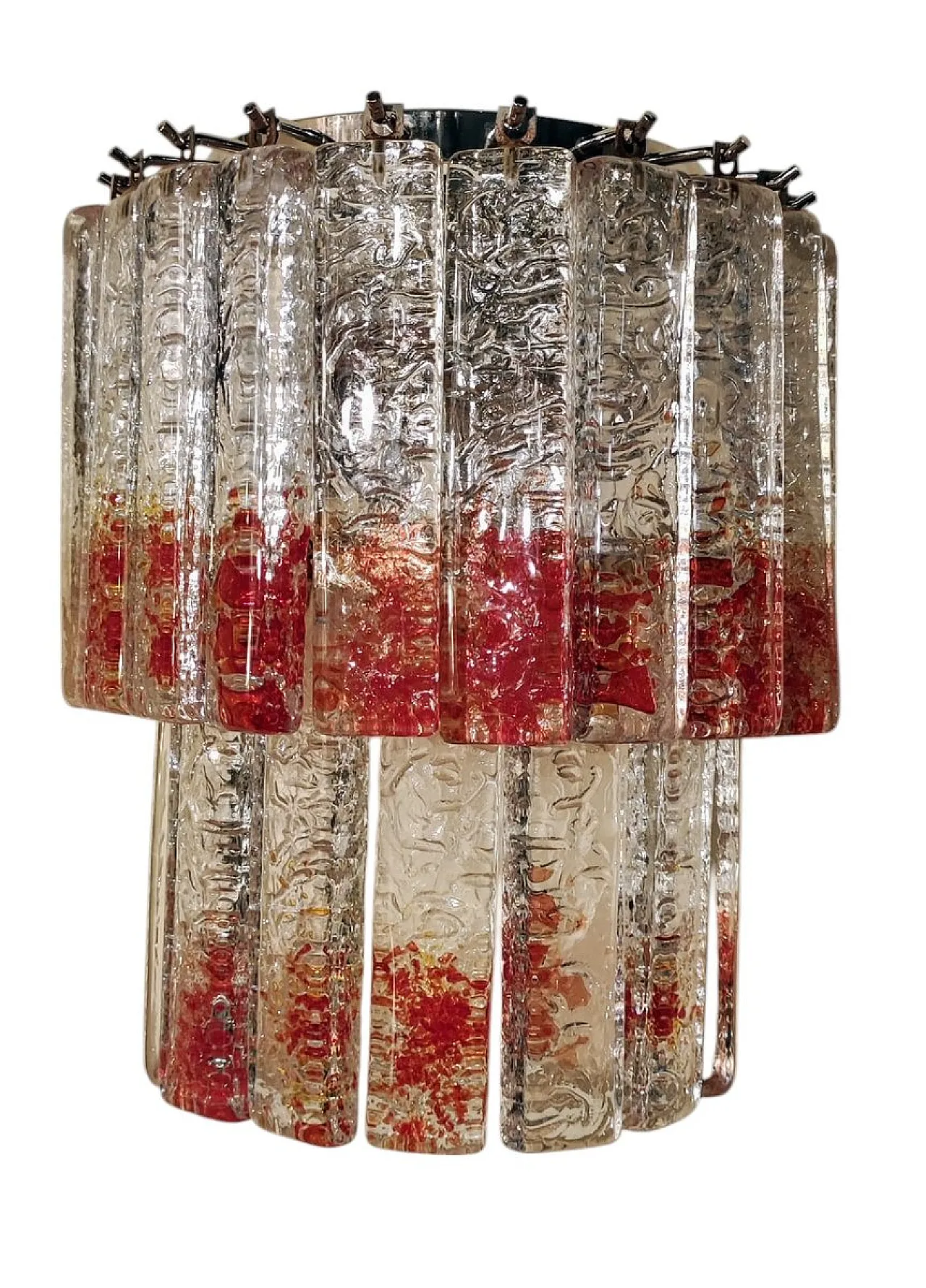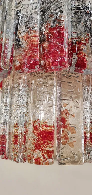 1970s Murano glass sconces. Solid clear glass rods with red edges arranged in two tiers, fits two E14 light bulbs, restored chrome mounts.