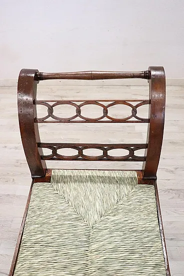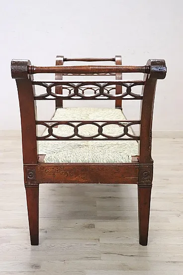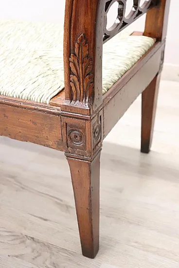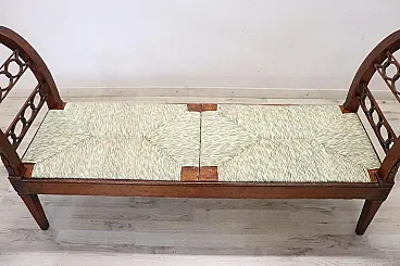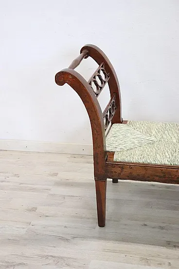 The bench has wooden floral carvings that enhance its aesthetics, even if it is important to note that these decorations are present only on one side, to indicate that it has been designed to be resting on a wall. The rustic straw seat, carefully restored with craft methods, adds character and comfort, while the wooden structure has been restored with conservative methods that maintain its historical integrity.