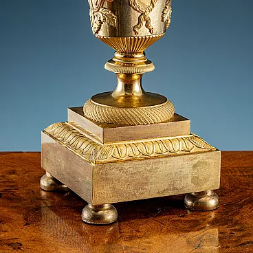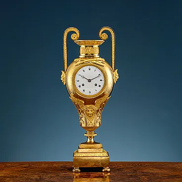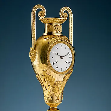 Vase clock in gilded bronze resting on a plinth decorated with successive leaf motifs resting on four ball feet. The body, with its characteristic double-edged vase shape, is adorned with finely chiseled and gilded bronze applications: in the lower part a winged medusa face is flanked by anthemes, while in the upper part a panoply rests, on the neck there is a head with butterfly wings; the two sockets are held by two masks and end in a curl on the neck of the vase. White enamelled display with Roman numerals.