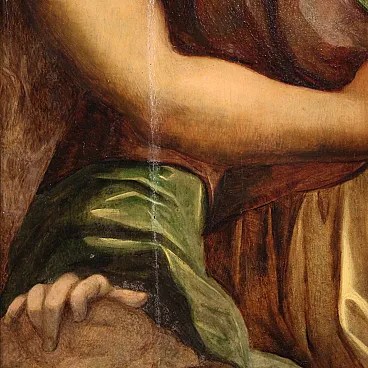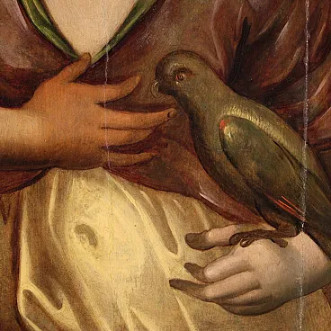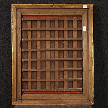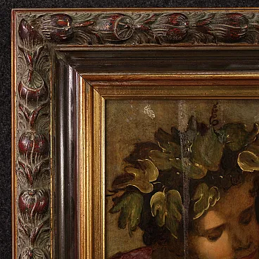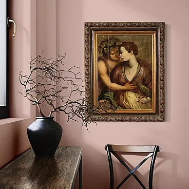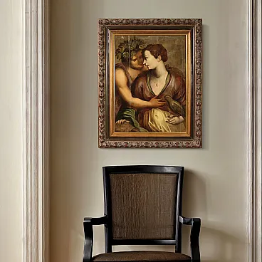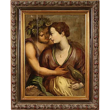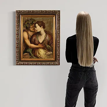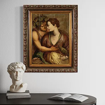 Splendid Flemish painting of the first half of the seventeenth century. Oil work on the table of excellent pictorial quality depicting a mythological subject of great charm, Bacchus and Arianna. The princess of Crete had been abandoned by Teseo on the island of Nasso after helping him to leave the minotaur labyrinth. Arianna will rescue Dionysus, divinity of ecstasy and wine, who will marry the beautiful princess in the presence of the gods. In our composition, the protagonists exchange an intense look; While Dionysus embraces Arianna she holds a parrot in the left hand, a symbol of marital loyalty but also of lust depending on the context. Picture already restored with the application of a resistant park on the back (see photo) and the recovery of color in small points. Scenographic frame of the twentieth century in carved and golden wood with floral and fruit motifs, with some signs of time. Overall operates in good conservative state. Painted light h 57 x l 42 cm.