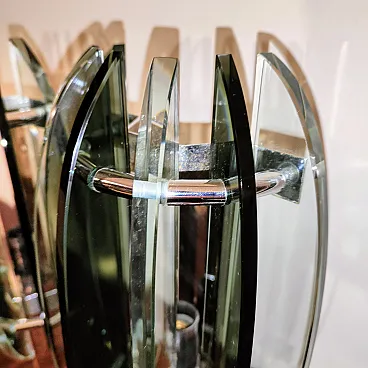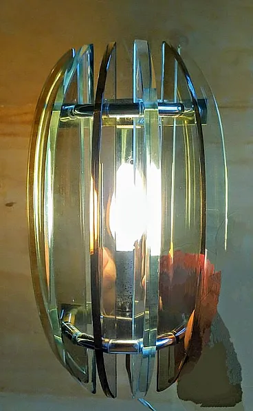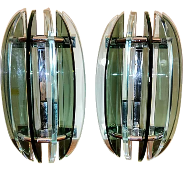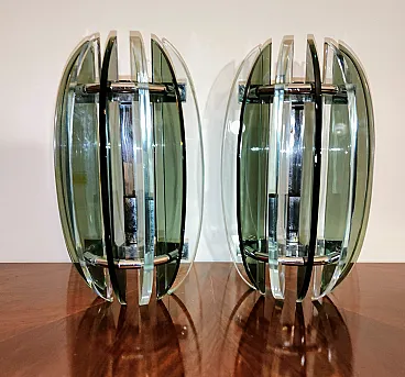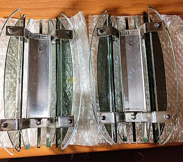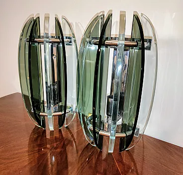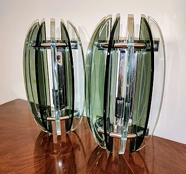 Pair of splendid vintage appliques, 70s, in green glass and aquamarine alternating with chromed accents. Spectacular vintage state, practically perfect. Working. Completely original electrical system, restore cable. The appliques were only clean and not polished to maintain the original state however splendid. Dimensions: Height: 28 cm Width: 16.5 cm Depth: 11 cm Sold as a set of 2. Attribution brand: present on the back of both appliques Materials: chromium, glass Place of origin: Italy