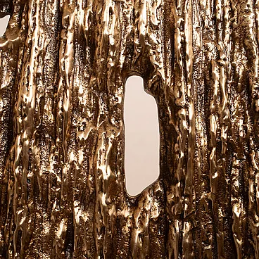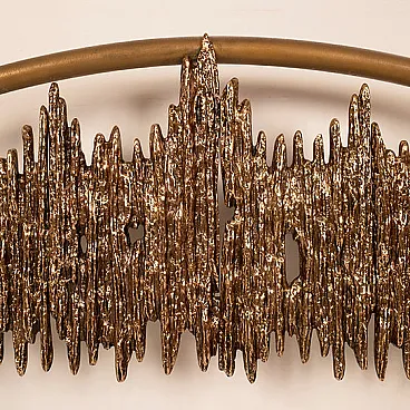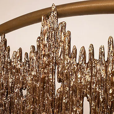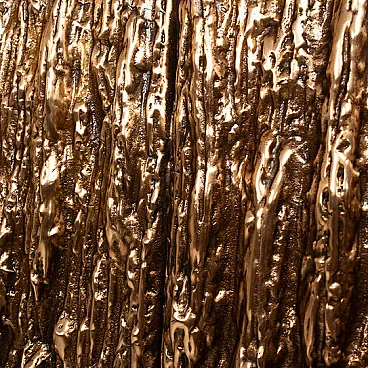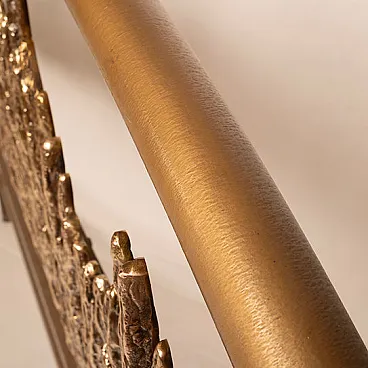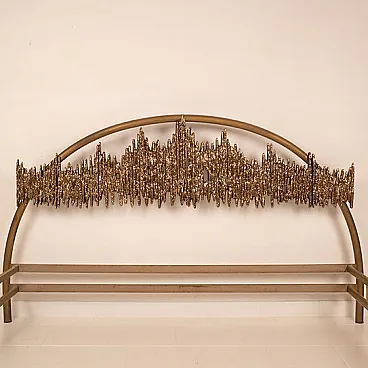 The bed is complete and composed of a wrought and textured iron arch structure which supports a majestic brutalist high -relief sculpture with a lost wax melting of brass, a work of a stordinary skill and composition technically like a real sculpture.