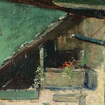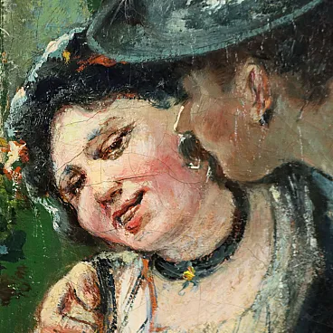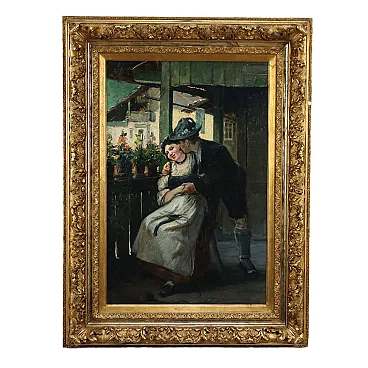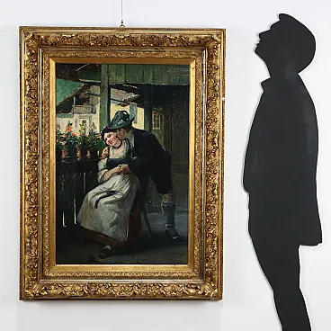Oil on canvas. The protagonists of the scene are a girl and a boy dressed in traditional Tyrolean clothes, a region to which the setting also refers, with its characteristic mountain chalets with flower-filled balconies; the girl, sitting knitting, joyfully receives the embrace of the boy, who takes her by surprise from behind. The pictorial style and subject matter refer to the production of some Tyrolean artists who tried their hand at popular and traditional genre scenes, including for example Hugo Kauffmann, specialized in popular interior scenes in costume. The painting, on the first canvas, shows traces of patches. It is presented in a gilded frame in style.