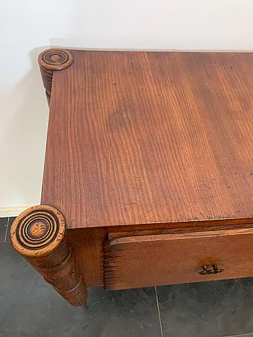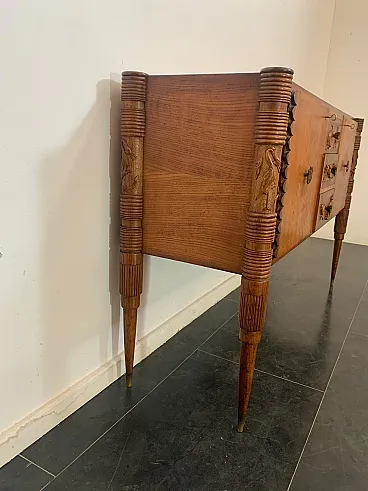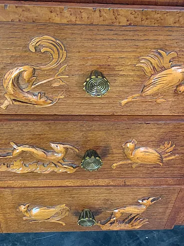 At the center, four sculpted drawers feature woodland animals, accompanied by two doors flanked by a splendid petal-shaped carving with a burnt finish.