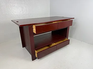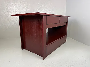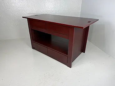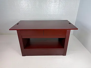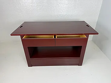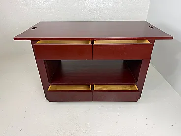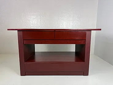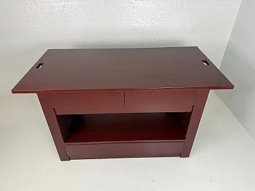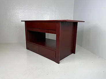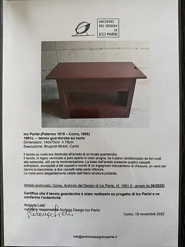 Rare table on wheels, wardrobe. The table was intended to furnish a wardrobe room. Made of open-pore painted wood in plum colour, the top is characterized by oval holes at the ends, useful for handling. The base of the furniture has four undercounter drawers, coupled on opposite sides and equipped with an ingenious closing mechanism, a compartment for storing linen, and two drawers in the lower part. The wheels are elegantly hidden by the entire supporting structure. Correlated with authenticity and expertise from the Ico Parisi Archive