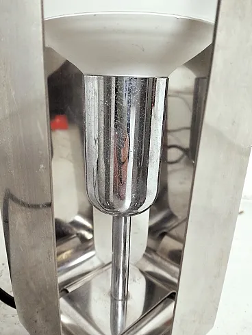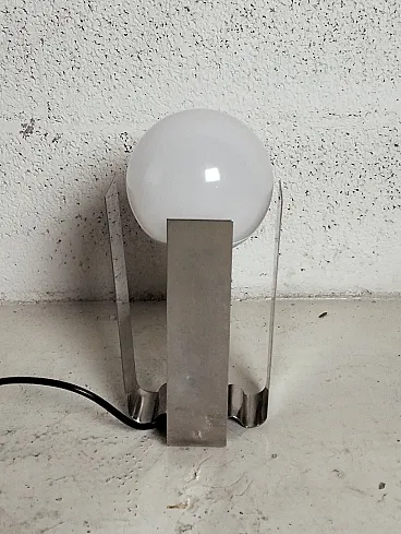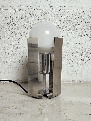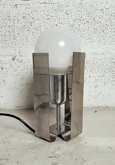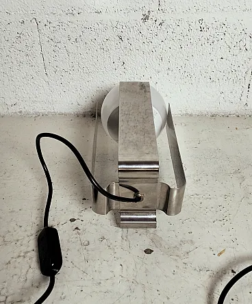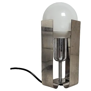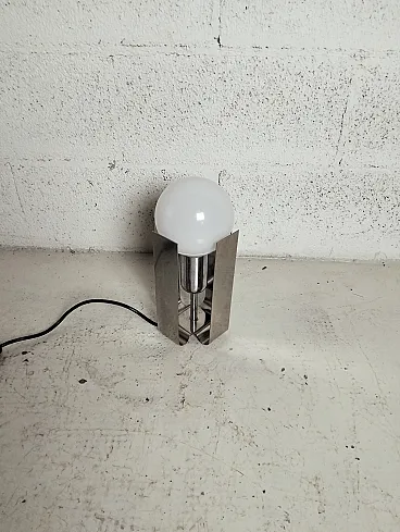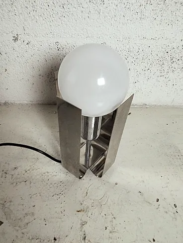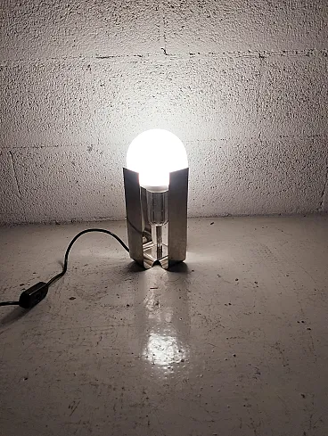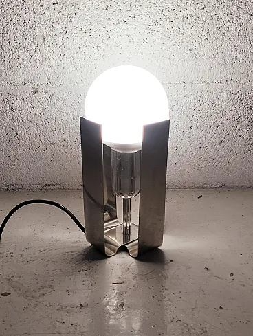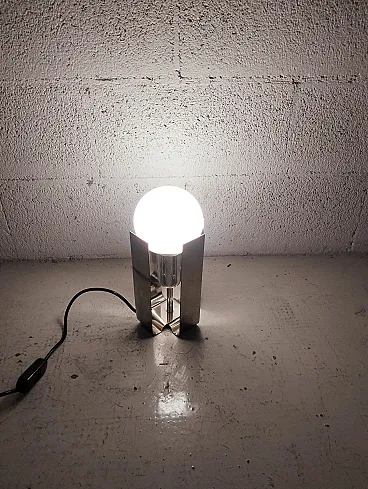 This table Lamp was designed in 1971 by Architect and Designer Claudio Salocchi as part of his prolific collaboration with the company lumenform. The Minimalist But Evocative Design Consists of Two Interconnected Chrome-Pilated Metal Slats, Onto Which a Lamp Holder, Also Chrome-Pilated, is grafted.