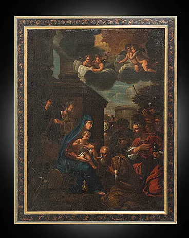 Description: Ancient painting oil on canvas depicting the adoration of the Magi, a favorite theme in ancient painting which, is divided into a traditional iconography, where in the face of the figures of the Holy Family, placed on the left of the composition, the three kings are portrayed sumptually dressed.