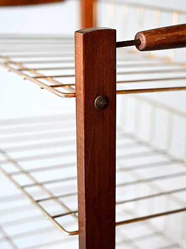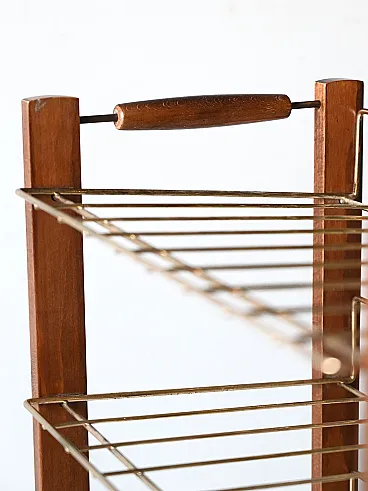 1950s holder with wooden structure and golden metal shelves. A piece of furniture with a vintage charm that can be used not only as a door -curtaine, but also as a rack in the bathroom or as a bedside table. Good condition. It may present signs of time. Pleasure pay attention to the photographs.