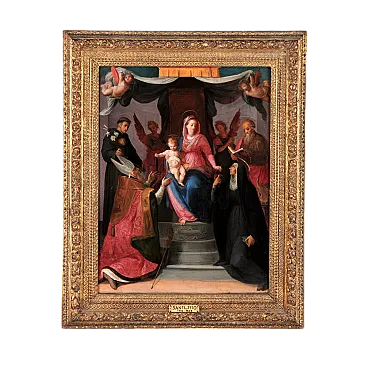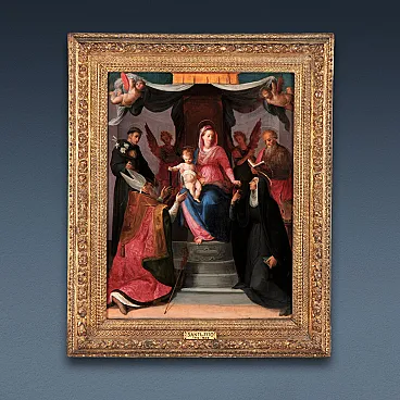 The painting presents the Madonna enthroned with the Child, two praying angels and the saints Nicola da Tolentino, Agostino, Luca Evangelista and Monica, beneath an elegant canopy. The work must be recognized as a preparatory sketch for a large altarpiece, still unknown today. Proof of this is the size of the panel, which is not suitable for an altarpiece in a church or even for a small chapel in a private residence; the painting, which in some places, such as the two angels on the sides of the Madonna and Child or in Saint Luke the Evangelist, is deliberately left in a rough state; and, finally, for the presence of evident repentance. In this regard, we can note the left arm of the holy bishop, initially thought to be closer to the right one, and the right hand of the saint. Even though the panel is a sketch, we can see some details of great pictorial refinement, demonstrating the quality of the painter and the importance that these objects had with respect to the final work: the gold finishes, for example in the Saint Nicholas of Tolentino, in the loincloth of the little angel at the top left and in the globe held by the Child, enrich the preciousness of the composition. The facial features of the figures are outlined with the tip of the brush, while the clothes are constructed with a more vigorous and less rigorous brushstroke, further demonstrating how the work was not to be considered independent. In this regard, observe the cope of the holy bishop, in which we can glimpse some figurative decorations - saints or apostles - and a decoration imitating velvet executed with a rapid brushstroke that effectively traces only the general profile. The Saints are characterized by a luminous palette which particularly highlights the central representation with the Madonna and Child, Saint Augustine and the angel at the top right. The shadows and lights are studied with particular attention: the two praying angels are wrapped in the shadow created by the canopy and the chiaroscuro effects on Saint Luke, Saint Monica and on the steps of the throne are accurate. The presence of the canopy is a clear legacy of the Florentine culture of the early sixteenth century: think of the altarpieces by Raphael (Madonna del Baldacchino, Galleria Palatina at Palazzo Pitti, Florence) and Fra Bartolomeo (Pala Pitti, Galleria Palatina at Palazzo Pitti, Florence) , from which our painter takes - as was still the norm in the second half of the sixteenth century in Florence - the general composition of the Sacred Conversation. Marco Collareta was responsible for attributing the work to Santi di Tito (Borgo San Sepolcro 1536 – Florence 1603) on the occasion of the famous 1980 exhibition: Palazzo Vecchio: Medici commissioning and collecting. On that occasion the scholar dated the panel in the mid-1560s, recognizing a close link with the altarpiece painted by the Tuscan painter in 1566 for All Saints' Day in Florence and noting in the painting still "the memory of the chromatic liveliness of the frescoes created by the painter during of his Roman stay by 1564" (M. Collareta, 552. Madonna with Child, Angels and Saints, in Palazzo Vecchio: Medici commissioning and collecting, Milan 1980, pp. 283-284.) The presence of the holy bishop Augustine and the Augustinian saints Nicola da Tolentino and Monica, leaves no doubt in estimating that the work was commissioned by a community of Augustinians or by a private individual devoted to that order. The presence of the Evangelist could be motivated by the dedication of an altar or a chapel to that saint, or by the client whose name must have been Luca. The Basilica of Santo Spirito is the home of the Augustinians in Florence and could certainly be a place for which Santi di Tito worked in this case. Considering how the painter, absolute protagonist of Florentine and Tuscan painting in the second half of the sixteenth century, was involved in different commissions in the Florentine countryside and in Tuscany (for example in Arezzo, Cortona and Grosseto) and the widespread diffusion of the Augustinian order in this and other regions, it remains difficult to specify their location.