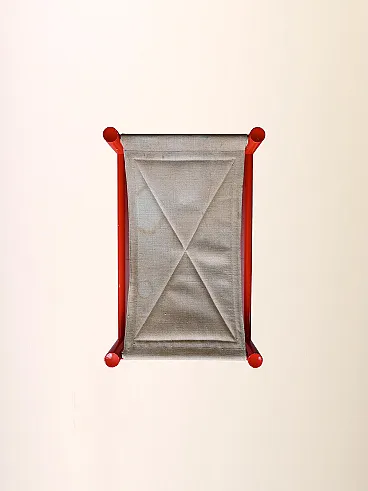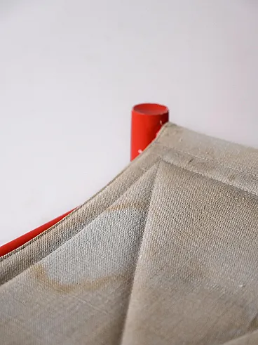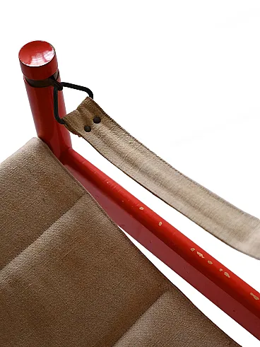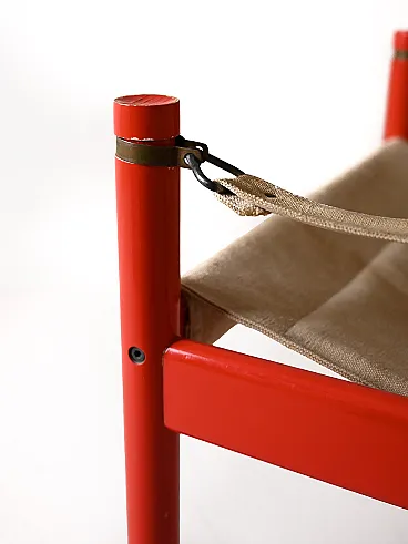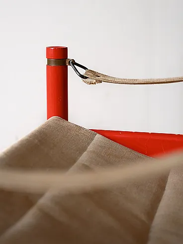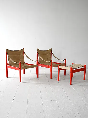 Pair of Scandinavian armchairs with red lacquered wooden structure and cream -colored fabric seat. There is also a coordinated footrest. Original and modern are perfect for characterizing an environment with a touch of vintage color and flavor. Good condition. It may present signs of time. Pleasure pay attention to the photographs.