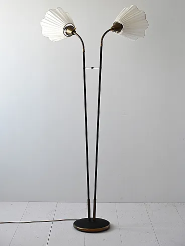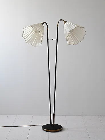 Vintage ground lamp, double pleated lampshade, elegant and functional design. Ideal for sophisticated and retro environments. This lamp has two thin thin rods that rise from a dark circular base, providing stability and a clean look. The white pleated, in the shape of a flower, give a touch of elegance and spread a soft and welcoming light. The brass stems connect the whispers to the rods, adding a refined detail to the overall design. The arrangement of the two lampshades allows balanced lighting, perfect for lounges, reading corners or bedrooms. The combination of black, white and brass gives the lamp a classic look, suitable for both modern and traditional interiors, adding charm and functionality.