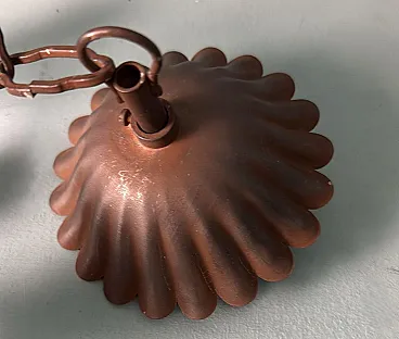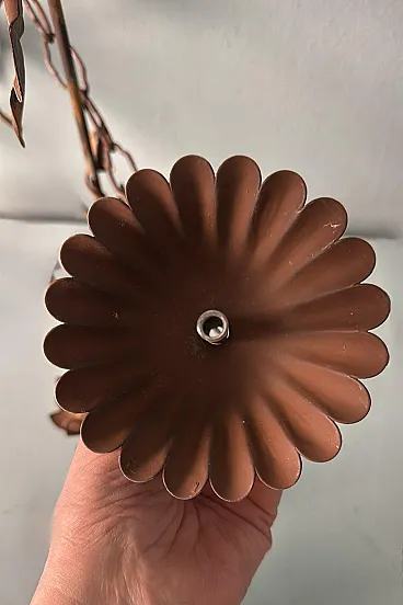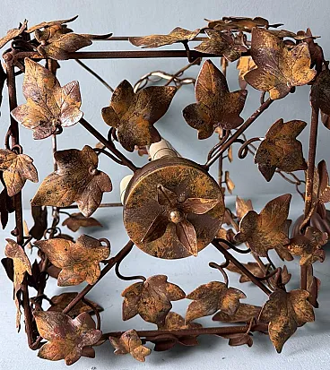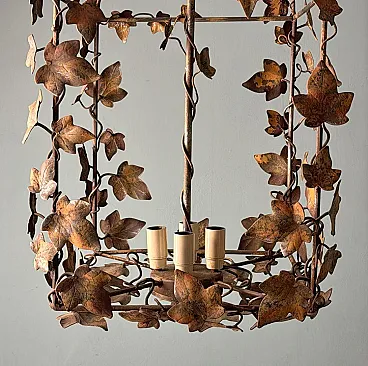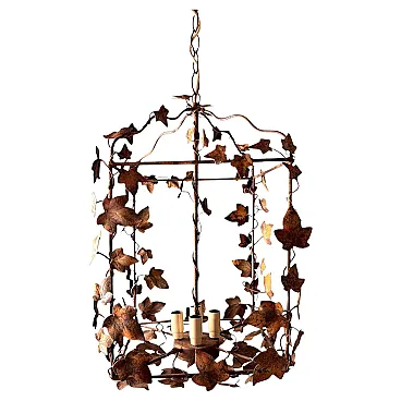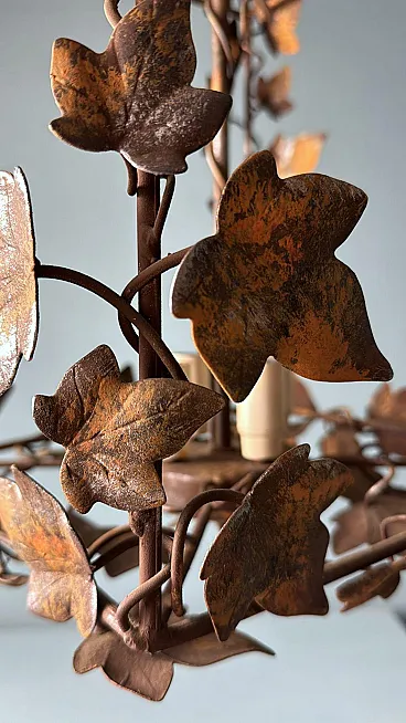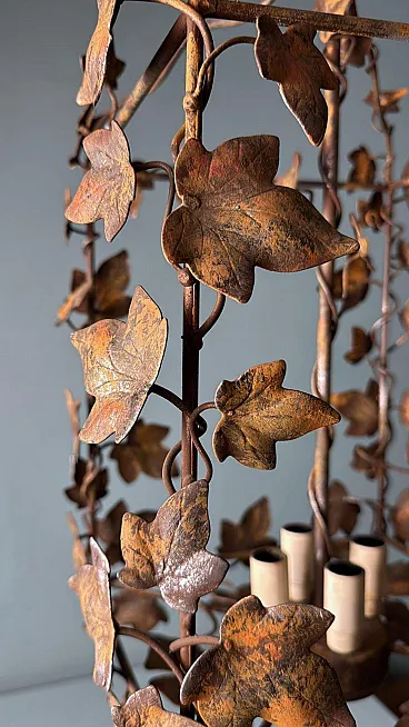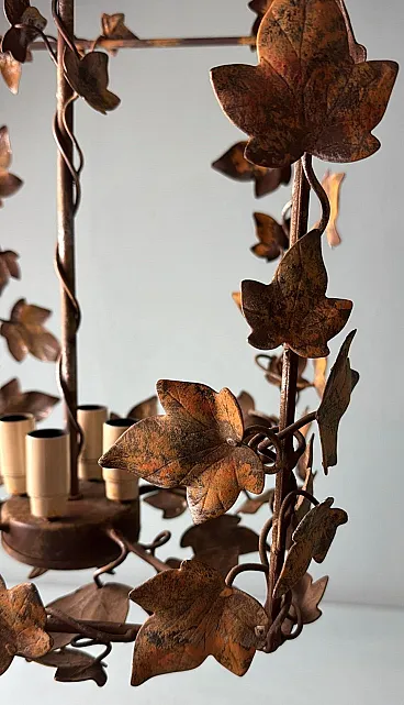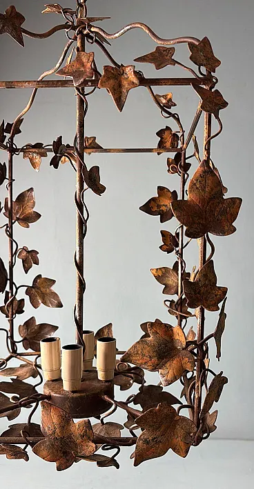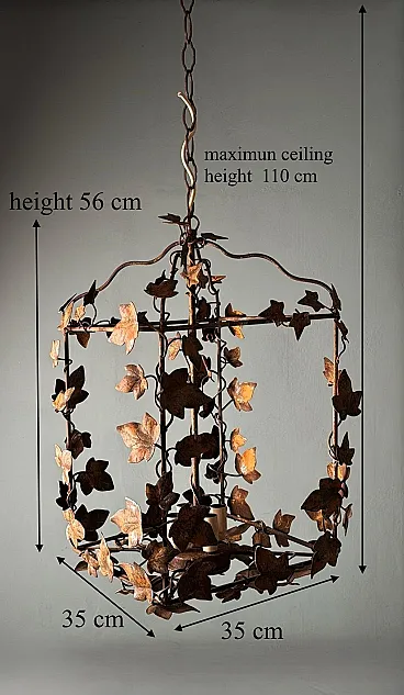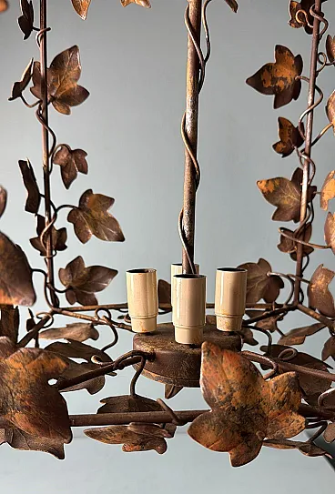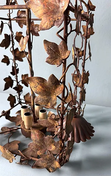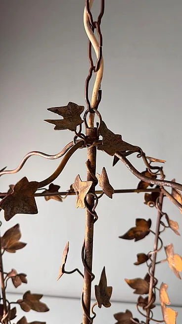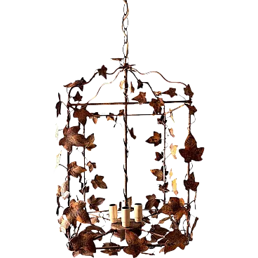 This refined wrought iron chandelier is a true masterpiece of Italian craftsmanship from the 1970s. Its solid yet elegant structure, adorned with intricate vine leaf decorations, evokes the art of hand-forged ironwork—a centuries-old tradition that gives each piece a unique and inimitable character. The aged burnished finish enhances the warmth of the wrought iron, while the structure, both lightweight and durable, ensures longevity and stability over time. The nature-inspired design, with its gracefully intertwined leaves, creates a captivating interplay of light and shadow, making any space feel warm and inviting. Wrought ironwork is one of the oldest artisanal techniques, dating back to ancient times when blacksmiths crafted weapons, tools, and decorative elements for buildings and furnishings. This process requires skill, precision, and creativity, as iron is shaped while hot, hammered over an anvil until the desired form is achieved. Each piece made using this technique is unique, thanks to slight variations and imperfections that enhance its charm. During the 20th century, particularly between the 1950s and 1970s, wrought iron experienced a resurgence in interior design, especially in Italy, where it was used to create chandeliers, railings, bed frames, and elegant, timeless decorative furnishings. This chandelier, with its sophisticated design and vine leaf embellishments, is a perfect example of this artisanal tradition. Its structure reflects the romantic and decorative style typical of Italian craftsmanship from the 1960s and 1970s—a time when artisan workshops focused on creating aesthetically striking pieces, often inspired by nature and the plant world. Handcrafted between 1970 and 1975 in Florence by a master artisan, this chandelier is a unique, precious, and elegant piece. Truly elegant objects are never associated with opulence but rather with the simplicity of beauty and harmony of form. Florence and its craftsmanship boast a centuries-old tradition, deeply rooted in the Middle Ages. Thanks to the guilds and the enlightened Medici rulers, the city and its skilled artisans became the epicenter of artistic production and craftsmanship, a legacy that continues to this day. Its compact size makes this chandelier perfect for various settings: it can elegantly illuminate a dining room, entryway, or bedroom, adding a touch of retro sophistication. The vine leaf design and burnished finish strongly recall the furnishings of countryside homes, particularly in Tuscany (Rustic Style) or Provence (Country Chic Style). These styles are characterized by the use of natural materials, artisanal finishes, and nature-inspired motifs, ideal for warm and welcoming spaces such as farmhouses, agritourism accommodations, or rural-style residences. A decorative piece of great historical and aesthetic value, ideal for those looking to enrich their space with a timeless and artisanal-quality furnishing. The chandelier is in good condition. The electrical system is functional, but the wiring is European: voltage compatibility in other countries should always be checked by an electrician before use. Dimensions: • Width: 35 cm • Depth: 35 cm • Height: 56 cm • Maximum height with chain up to the ceiling: 110 cm