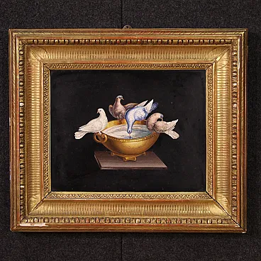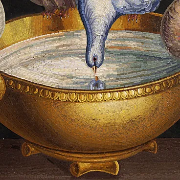 Gorgeous Italian micromosaic of the 19th century. Also called the minute mosaic or miniature mosaic or spinning mosaic, it is a technique presented for the first time in Rome in 1775 in the mosaicist shop Giacomo Raffaelli. This technique reached its peak in the middle of the 19th century thanks to the production of minute enameled glass tiles and had a huge success as souvenirs among foreigners visiting Italy for the Grand Tour. Micromosaic of great pleasantness depicting the wonderful birds that are drinking, the famous Capitoline doves also called pliny doves. The composition in fact resumes an original Roman mosaic that was discovered at Villa Adriana in 1737 Overall operates in good conservative state. Internal measures H 27 x L 34 cm.