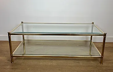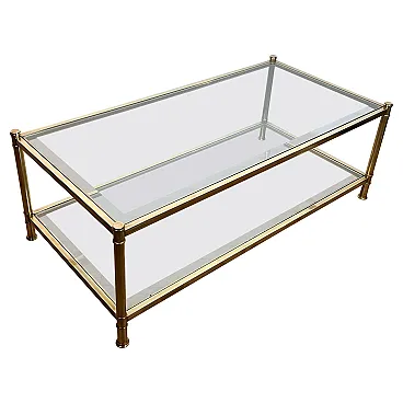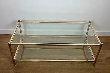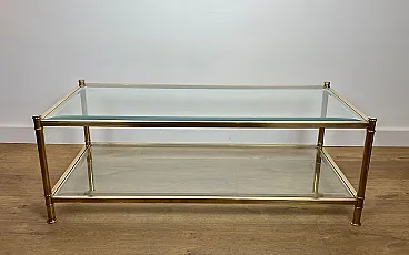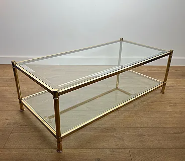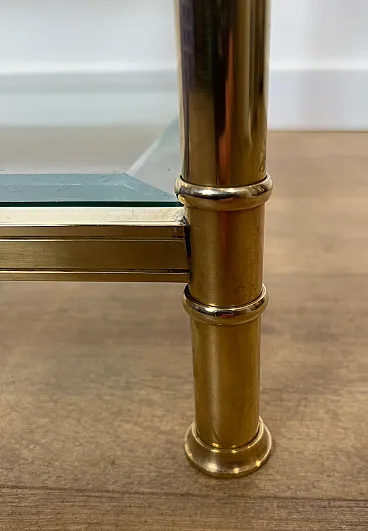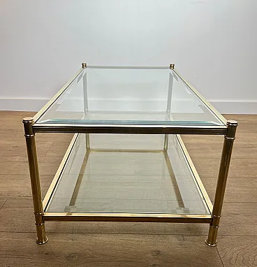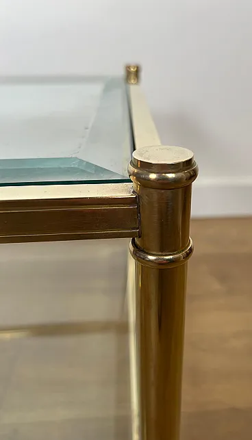 This very nice and elegant coffee table is made of brass with 2 glass shelves. The top glass is beveled all around.r. This is a French work by Roche Bobois. Circa 1970